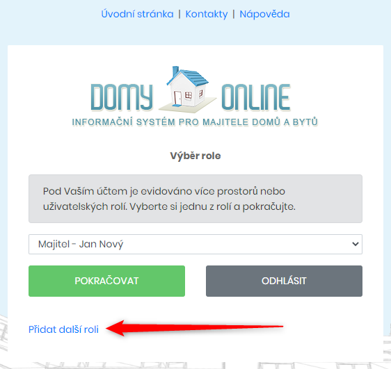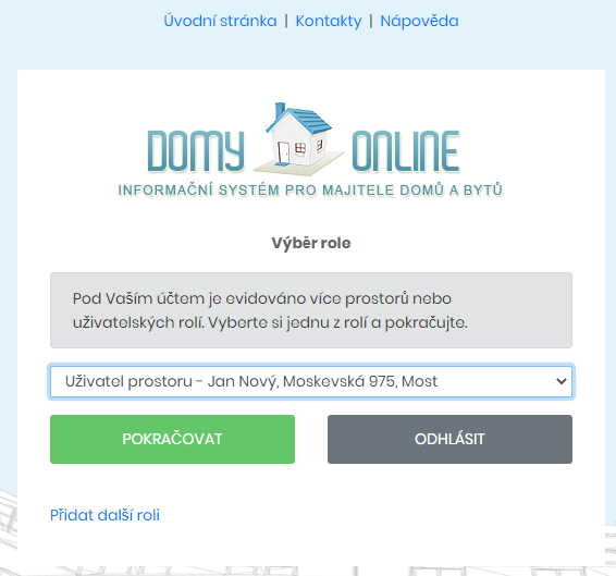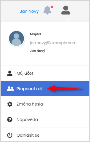 Nejprve se uživatel přihlásí do svého účtu a uživatelském menu zvolí volbu Přepnout roli.