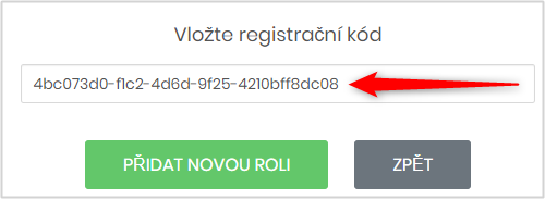 Do vyskakovacího okna pak zapíše registrační kód nového prostoru, který obrdržel od správce a stiskne tlačítko Přidat novou roli.